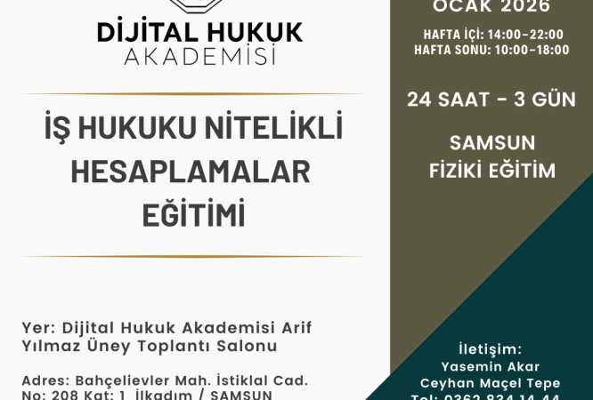 Yer: Dijital Hukuk Akademisi Arif Yılmaz Üney Toplantı Salonu Adres: Bahçelievler Mah. İstiklal Cad. No: 208 Kat: 1 İlkadım / SAMSUN 9-10-11 Ocak 2026 24 saat – 3 gün