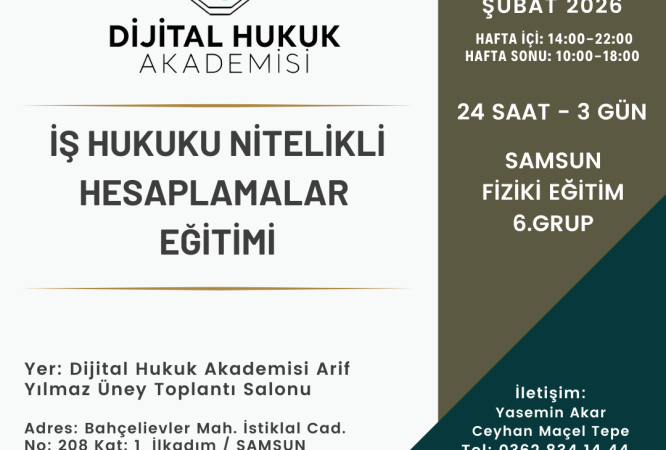 Yer: Dijital Hukuk Akademisi Arif Yılmaz Üney Toplantı Salonu Adres: Bahçelievler Mah. İstiklal Cad. No: 208 Kat: 1 İlkadım / SAMSUN 6-7-8 Şubat 2026 24 saat – 3 gün