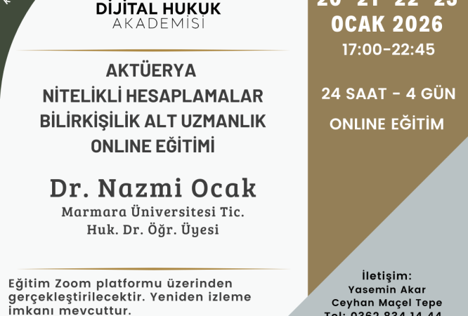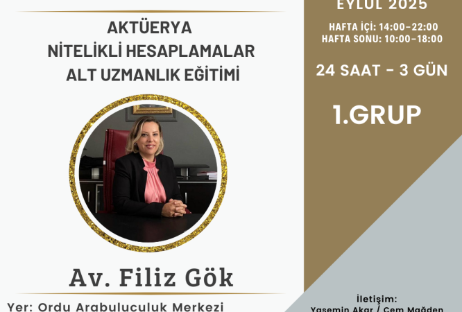 Aktüerya Eğitim Desteği 25-26-27 Ağustos 2025 18:30 – 22:30 Stajyer avukatlar – 1 Yıla kadar kıdemi olan avukatlar – HMGS’ye hazırlanan Hukuk Fakültesi mezunları için ücretsizdir. Eğitmen: Av. Filiz Gök